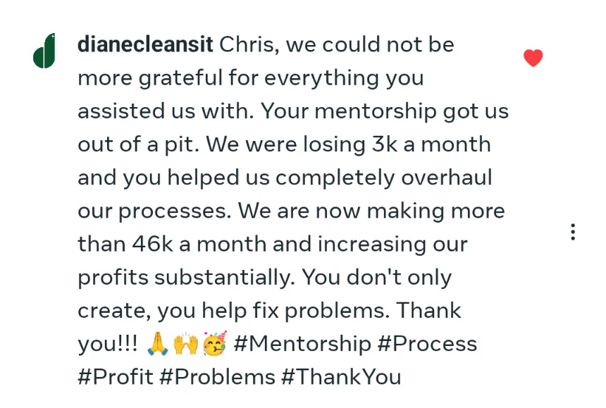 Las cifras de ventas indicadas son de mi empresa de limpieza, comprenda que los resultados no son típicos, no estoy insinuando que los duplicará. Utilizo estas cifras de ventas solo como ejemplo, sus resultados variarán y dependerán de muchos factores, incluidos, entre otros, sus antecedentes y ética de trabajo.